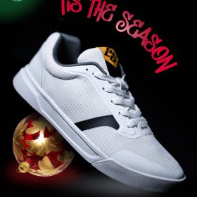 Red sneaker with a vibrant abstract background for California footwear business.